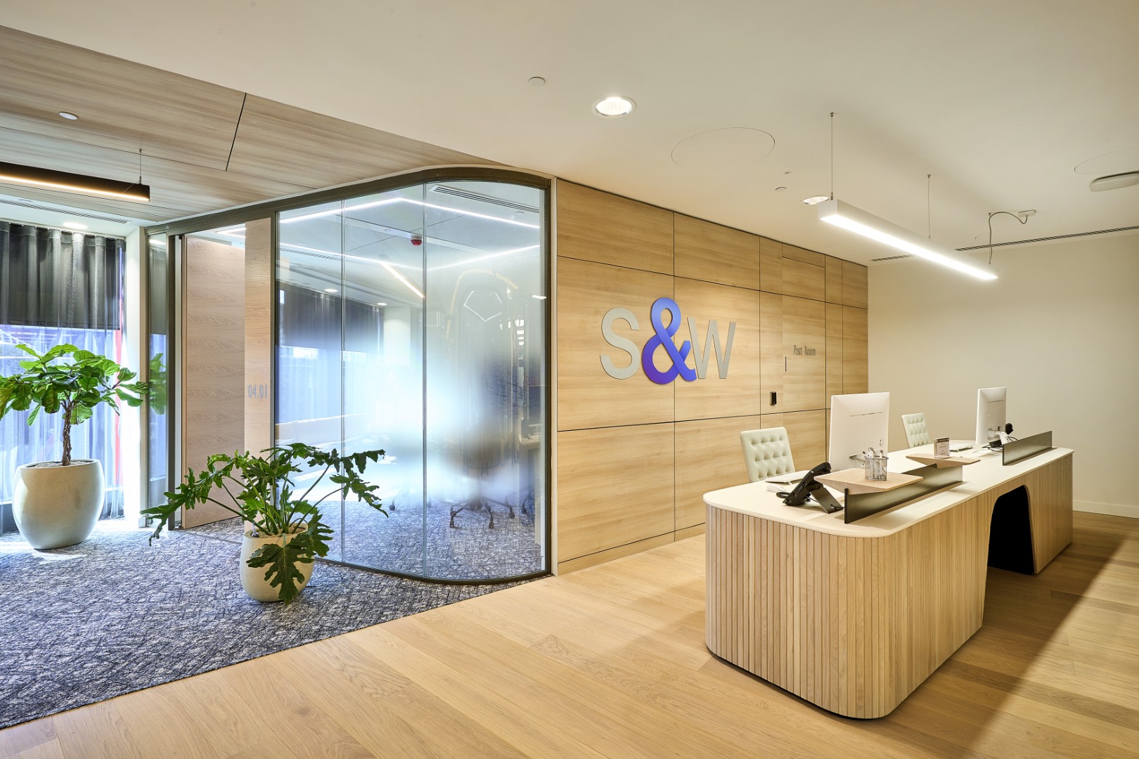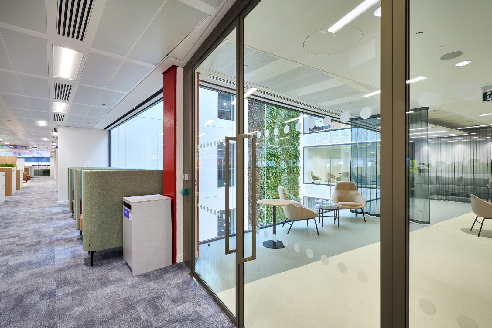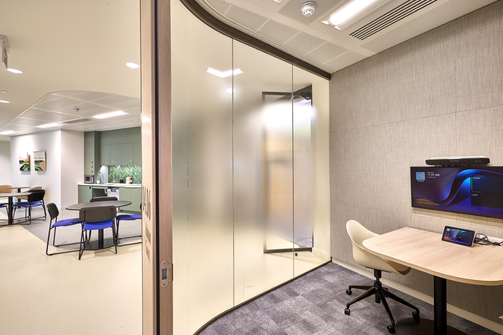 High acoustic rated timber doors and side panels to lobby areas, dual swing double leaf glazed doors, curved glazing